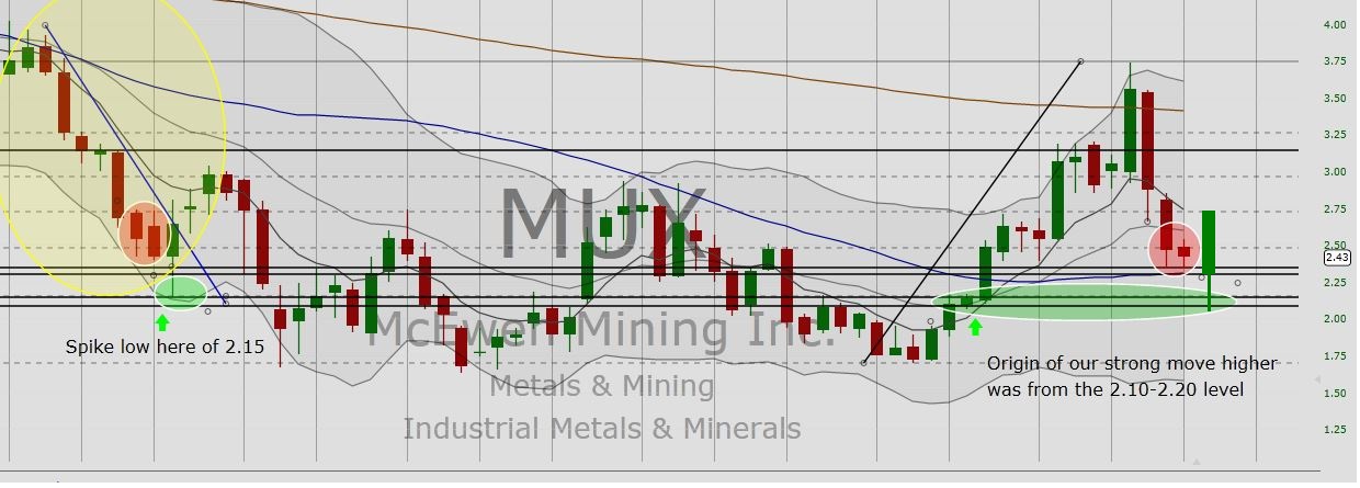 The weekly pattern in MUX is very similar to what happened a year or so ago as highlighted in yellow on the chart. Although the drop this time was much quicker and more dramatic, you can see price dropped from a year ago from the 3.70 level, paused briefly at 3.00 fell to the 2.40 for 2 weeks and then had a spike down to 2.15 before launching up to a high of 2.81 settling that week at 2.64. I would not at all be surprised to see that happen again as we hold the 2.40 level here currently. But if you look at the chart you can see that the real origin of our initial big move from the lows originated once we broke out and above the 2.10 - 2.20 level. The demand levels at 3.00 and 2.65 did not hold and based on my trading instruction you can bet based on that big green candle leaving that area that there are almost certainly a large number of institutional buys orders sitting there waiting to be filled in the mid teens. I'm not saying it will happen, but, I am prepared for it to happen and will be buying if it does.