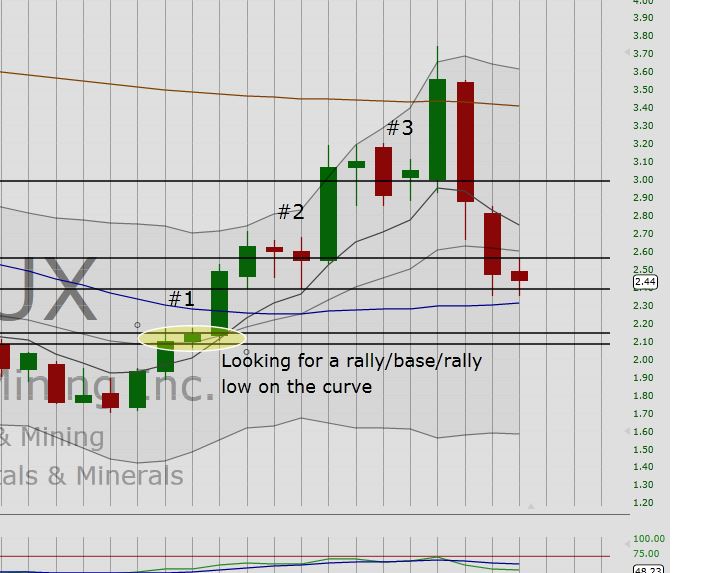 Well here's what I see Jammes. And its that 2 teens level. When I'm looking for key supply or demand levels on a chart, in other words area's on the chart that indicate strong institutional buying, I'm looking for explosive moves higher as indicated buy long extended range green candles. And I'm looking for a level that is FRESH, meaning price has not come back to that level and a level that is LOW on the curve. Meaning about a 70-75% retracement from the overall move from bottom to top and you want to see price come back to that level in a somewhat dramatic fashion like a 90° to minimum 45° retracement. What you see on this chart are two smaller back to back extended range candles coming off the bottom with a very tight one week basing candle right in the 2.06 - 2.17 range for that week followed by a much bigger extended range green candle which is only .03¢ in its overall range of the two lower candles wrapped up in one candle. As you can see candle #3 did not hold as demand as price blew right through that level, while candle #2 also did not hold as demand and price fell below the lowest candle in that base. That opens up the area circled in yellow as THE freshest level of strong demand and it also happens to be just below a 75% retracement. In other words it is an ideal location based on the parameters we use in our training as an area that offers a high probability of a large number of institutional buy orders sitting, waiting to be filled. My expectation if/when price hits that level is that it will be a strong move from that level similar to the prior move from that level. I personally have my buy orders in at that level.