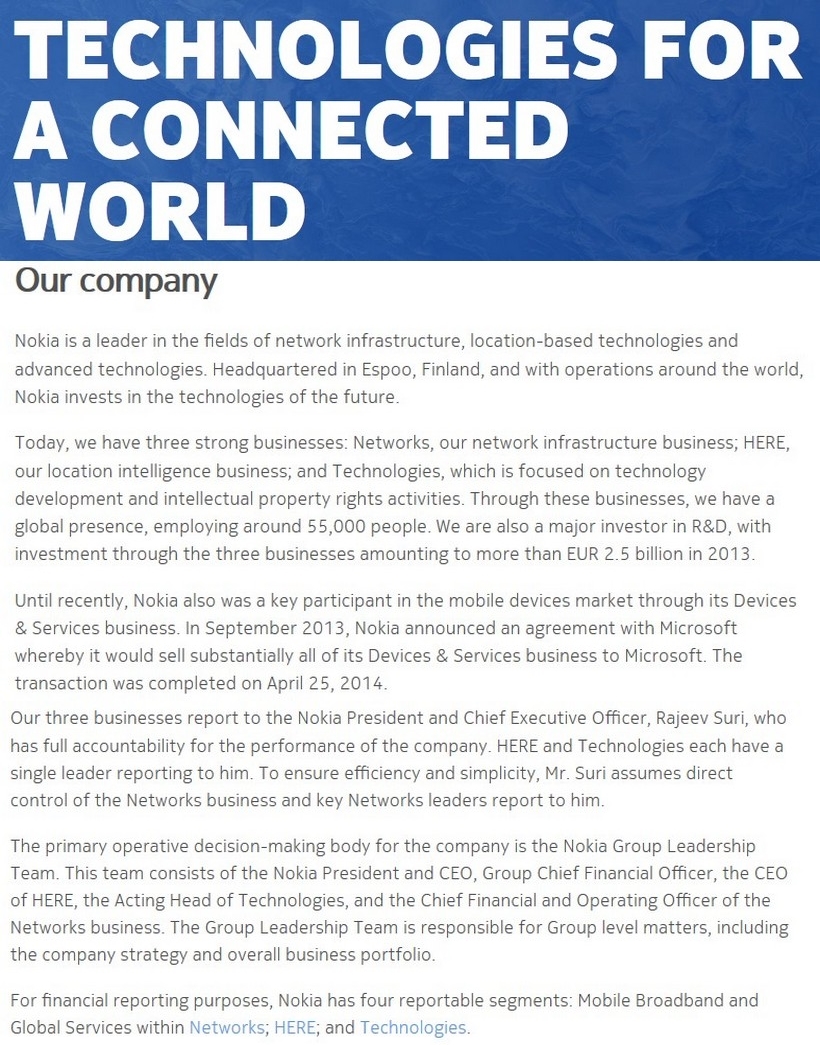 Nokia is no longer a pulp mill or manufacturer of gum boots and it's Devices & Services business is now owned by the largest global developer and marketer of software which is accelerating its transition to a Softwre devices and services company. However, anybody that follows the mobile wireless industry seriously, and that has paid attention to the news out of Espoo over the last week knows that Nokia (NOK/NOK1V) is alive and well, financially sound, has a patent portfolio broader than any other mobile wireless player and 2nd only to Qualcomm in value, is an established industry leader although not the leader, owns and operates the leading digital mapping and navigation service and licensor. and is led by exceptionally talented and experienced management team.