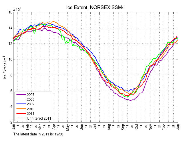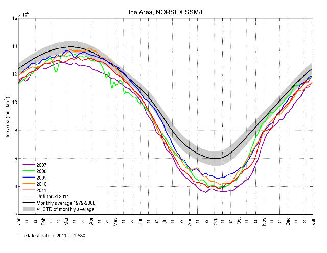 However his own graphs do give away his nonsense yet again, sea ice extent and area for 2011 was below all the years 2007 – 2010 at some time or other during the year, so a similar but opposite claim could be made by cherry picking a particular month. Of course, unlike Goddard, I’m not silly or desperate enough to even suggest that is a valid thing to do as Goddard has done here.