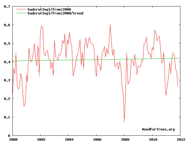 His supporting graph does show slight cooling of about 0.05C but starts in 2001 NOT 2000 when most people would agree this century actually started. Plot it from 2000 and the results show a slight increase in temperature, but it is essentially flat over such a short time scale. What it definitely does NOT show is ‘Global temperatures are declining this century’.