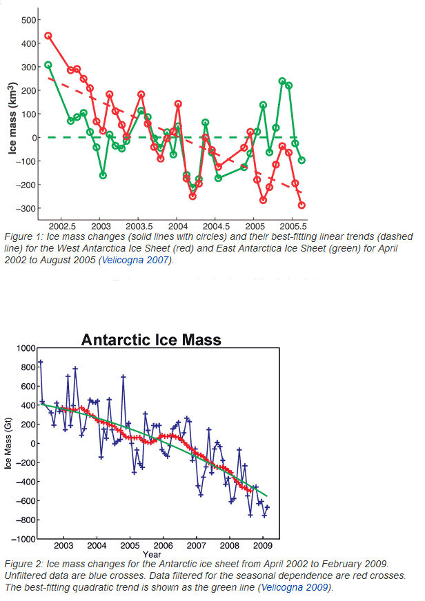But Antarctic Land Ice is decreasing and over all ice mass is falling. Not only is Antarctica losing land ice, the ice loss is and every year, the rate of ice loss is increasing by 26 Gigatonnes per year. ( Chen 2009)