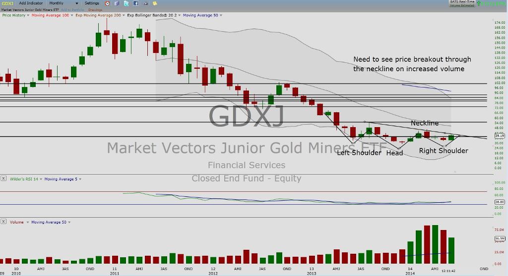 The GDX chart is even more staggering as its data goes back even further. These are record volumes and tells me that someone is massively accumulating at a bottom expecting much, much higher prices into the future. The current volume in the GDX is multiples higher of what it was at the bottom of 2008. Volume at the bottom of 10/31/08 was 167.2 million on the monthly vs 600 million to over a billion per month since forming the top of the left shoulder on this current bottom. This is one of the best classic H & S bottoms I have ever seen. These are staggering pictures IMHO. How many of the gold bugs have been claiming for months that this sector is set up at these levels to see massive, massive % gains of 1,000% or more in some cases. This sector in the coming years will probably see gains unlike any other in history. And I am not about to try and catch the exact bottom because when the train leaves the station you will want to be on board.