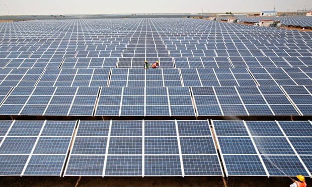 Workers install photovoltaic solar panels at the Gujarat solar park under construction in the western Indian state of Gujarat. Photograph: Amit Dave/Reuters