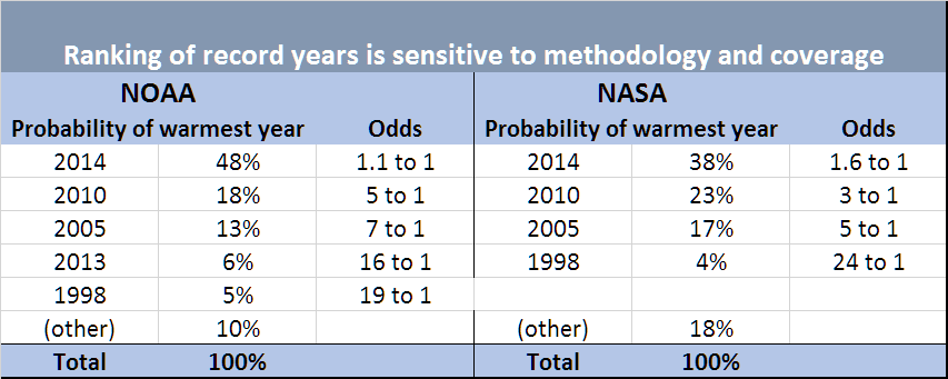 I've done two things. I've shown that the percentages are meant to be compared to one another by putting in the total at 100%. I've also converted the percentages to odds (of a sort). The clear favourite is 2014 - from both NOAA and NASA.