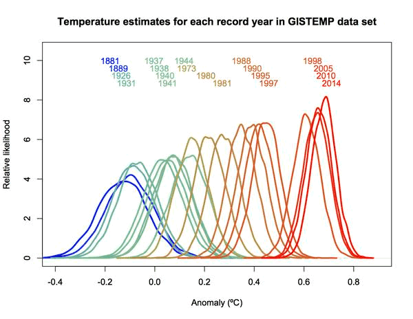 That's right. While individual years are close to being the record hot year, It's 1½ to almost three times more likely that 2014 is the hottest year in the record to date, than that the second ranked 2010 is.