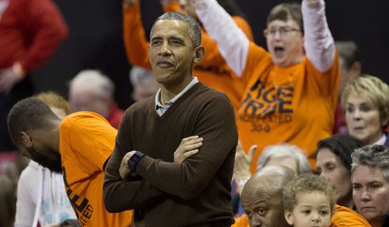 Barack Hussein Obama, center, smugly watches the player’s introductions of the Princeton vs Green Bay women’s college basketball game in the ...