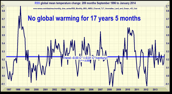 Taking the least-squares linear-regression trend on this dataset (the bright blue horizontal line through the dark blue data), there has now been no global warming – at all – for 17 years 5 months.