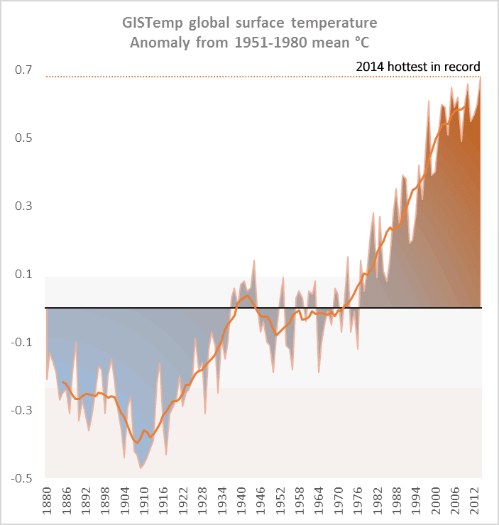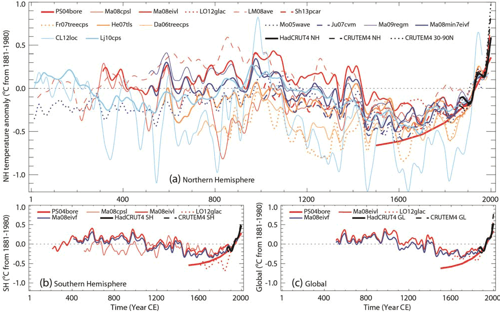 | | Figure 5.7: Reconstructed (a) Northern Hemisphere and (b) Southern Hemisphere, and (c) global annual temperatures during the last 2000 years. Individual reconstructions (see Appendix 5.A.1 for further information about each one) are shown as indicated in the legends, grouped by colour according to their spatial representation (red: land-only all latitudes; orange: land-only extra-tropical latitudes; light blue: land and sea extra-tropical latitudes; dark blue: land and sea all latitudes) and instrumental temperatures shown in black (HadCRUT4 land and sea, and CRUTEM4 land-only; Morice et al., 2012). All series represent anomalies (°C) from the 1881–1980 mean (horizontal dashed line) and have been smoothed with a filter that reduces variations on timescales less than ~50 years. Source: IPCC AR5 WG1 |