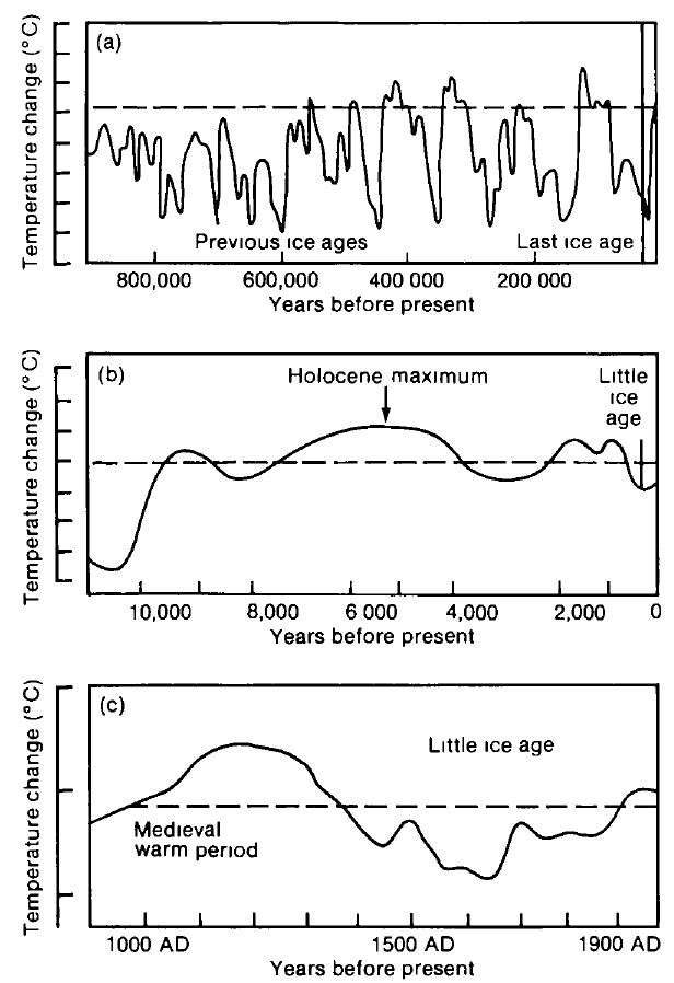 | | Figure 7.1: Schemat1c diagram of global temperature variations since the Pleistocene on three time scales (a) the last million years (b) the last ten thousand years and (c) the last thousand years. The dotted line nominally represents conditions near the beginning of the twentieth century. Source: IPCC FAR (1990) | Tim says that the IPCC created three "problems": The three problems it created were - The Medieval Warm Period (MWP) contradicted their claim that the 20th century was the warmest ever.