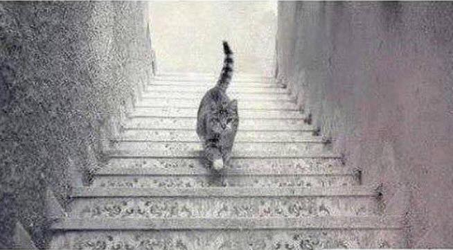 Is this cat going up or coming down the stairs?