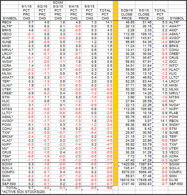 Quite a bit of red this week, all results at the bottom line are in the red. The semis fared worse than the major indices. Bottom line, the number was a -9.8.