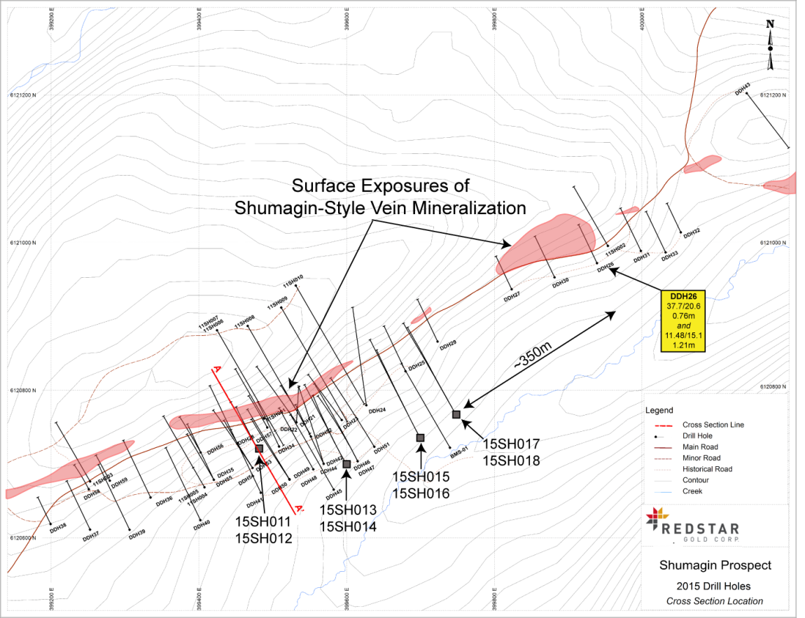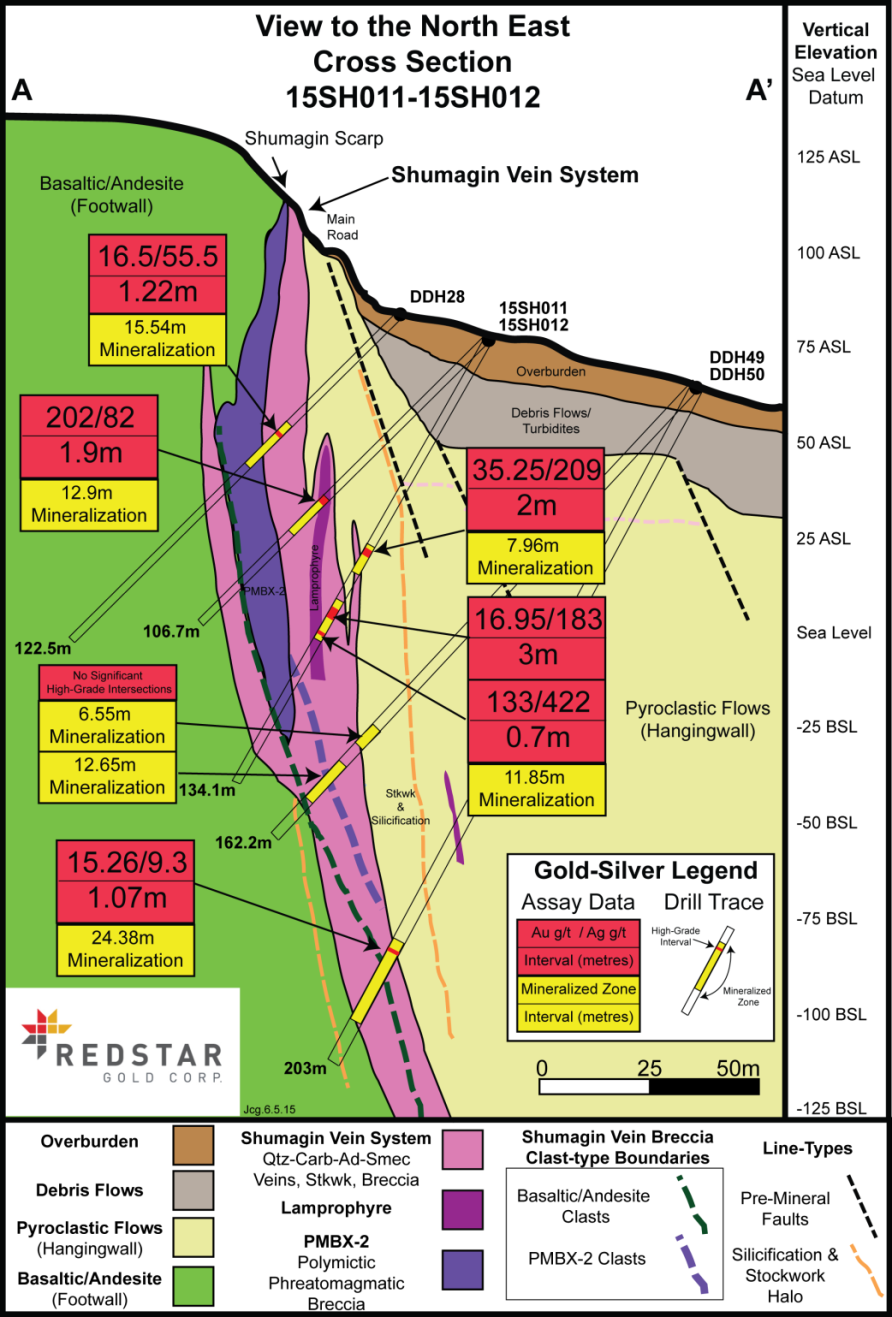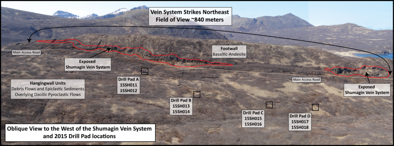 High-grade intervals have previously been encountered at Shumagin and commonly occur within broader zones of gold-silver mineralization. The objective of the current programme was designed to target various structural elevations of the Shumagin vein system while systematically: 1) testing for continuity of mineralization and obtaining geological constraint within areas of existing known high-grade mineralization through infill drill holes (15SH011-through-15SH014); and 2) exploratory step-out drilling of the vein system at depth and along strike to the northeast by approximately 100 metres through four step-out drill holes (15SH015-through-15SH018).