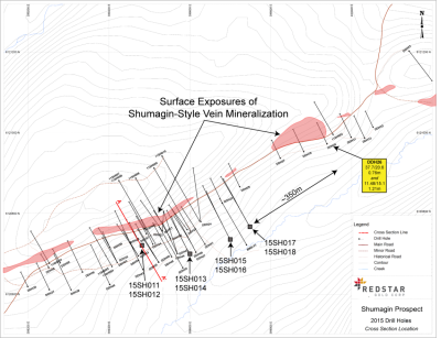 The precious metal-bearing Shumagin vein system has a strike extent of over 1.2 kilometres and a depth extent of approximately 330 metres as outlined by drilling and surface trenching. The Shumagin Prospect is one of several noteworthy gold-silver structures found on Redstar's Unga Project and is a high-priority exploration target that remains open at depth and along strike.