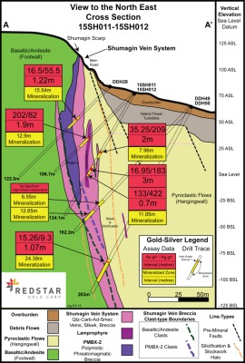 Redstar Gold announces assay results for the first two core holes from its recently completed eight-hole drilling program on the Shumagin Prospect, located on Redstar's 100% owned Unga Gold Project, Alaska. Some very high-grade intervals have been encountered with reported values of up to: 202 g/t gold & 82 g/t silver over 1.9 metres and 133 g/t gold & 422 g/t silver over 0.7 metres.