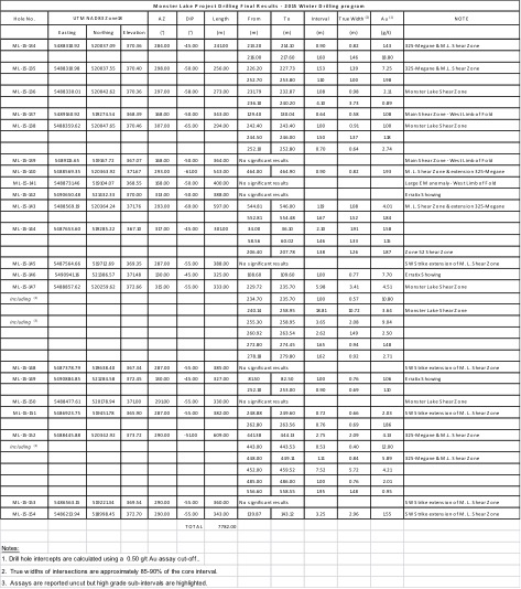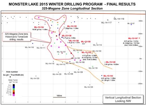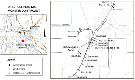 The 2015 winter drilling program was designed to evaluate priority targets identified from a target generation exercise completed over the entire property and take advantage of winter access conditions. Target areas evaluated included: the west limb of the prominent folded unit along which new gold showings were identified in 2014; the south-west and north-east strike extensions of the 325-Megane Zone and the structural corridor referred to as the Monster Lake Shear Zone ("MLSZ"); as well as the Zone 52 and Eratix prospect areas. A few of the holes were drilled to better delineate the 325-Megane Zone.