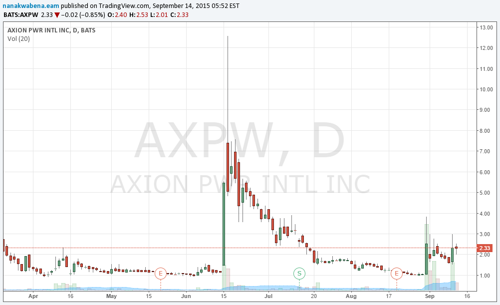 $AXPW closed down 0.85 percent on Friday, September 11, 2015, on 1.73 times normal volume.
