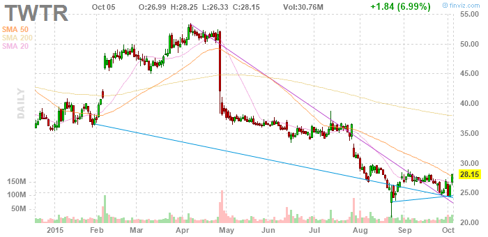 $TWTR closed up 6.99 percent on Monday, October 5, 2015, on 1.41 times normal volume. The stock rose above its 50 day moving average, improving its intermediate-term outlook by crossing above that important trendline.