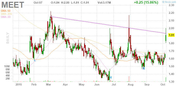 $MEET closed up 15.06 percent on Wednesday, October 7, 2015, on 9.31 times normal volume. The stock crossed above its 200 day moving average, improving its long-term outlook by crossing above that critical trendline.