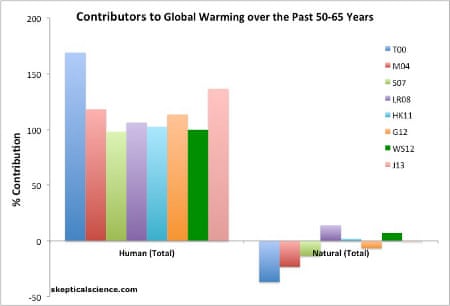 Net human and natural percent contributions to the observed global surface warming over the past 50-65 years according to Tett et al. 2000 (T00, dark blue), Meehl et al. 2004 (M04, red), Stone et al. 2007 (S07, light green), Lean and Rind 2008 (LR08, purple), Huber and Knutti 2011 (HK11, light blue), Gillett et al. 2012 (G12, orange), Wigley and Santer 2012 (WS12, dark green), and Jones et al. 2013 (J12, pink).