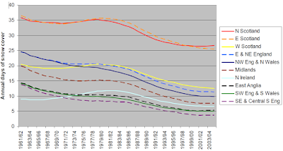 Anthony Watts is also canny enough to not post some other parts of the article. For example, the March 2000 article included the following indication that David Viner was talking about a future 20 years or so away - from 2020 and beyond, which hasn't happened yet: Heavy snow will return occasionally, says Dr Viner, but when it does we will be unprepared. "We're really going to get caught out. Snow will probably cause chaos in 20 years time," he said. Snow trends in the UK In 2006, six years after than newspaper article was published, a report from the UK Met Office showed that snow cover has been declining since the 1960s. Below is a chart from that report: