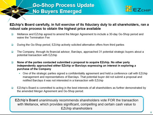 As shown below, EZchip provided some color during the go-shop process by proactively approaching 31 potential buyers who declined to offer superior proposals. No other company approached EZchip and showed interest in an acquisition.