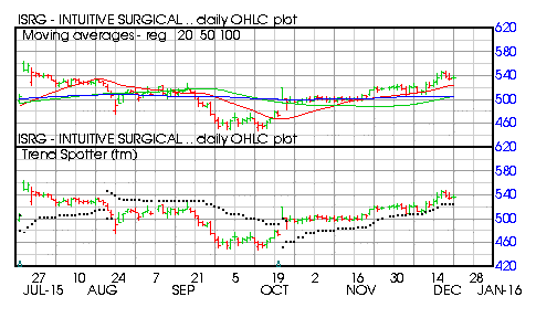 With the Market trading below its 20, 50 and 100 day moving averages I wanted to see if there were any of the NASDQ 100 stocks trading above their moving averages. I used Barchart to sort the Index's stocks for the highest technical buy signals and my list today includesJD.Com (JD), Activision Blizzard (ATVI), Mattel (MAT), Intuitive Surgical (ISRG) and Liberty Global (LILAK).