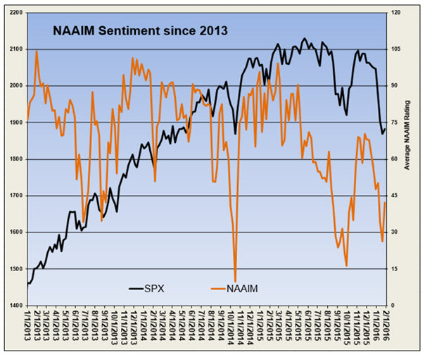 Another sentiment indicator that bulls should welcome is the weekly National Association of Active Investment Managers (NAAIM) survey, which attempts to quantify the equity allocation among investment managers surveyed. After reducing allocations since early December from mid-range levels, it appears this group is shopping equities at present -- but remain relatively underweight. Per the chart below, attractive buying opportunities have historically occurred when this group begins increasing allocations from low levels, which appears to be the case now.