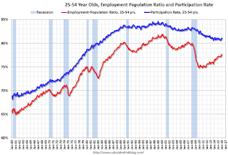 The 25 to 54 participation rate increased in January to 81.1%, and the 25 to 54 employment population ratio increased to 77.7%. The participation rate for this group might increase a little more (or at least stabilize for a couple of years) - although the participation rate has been trending down for this group since the late '90s.