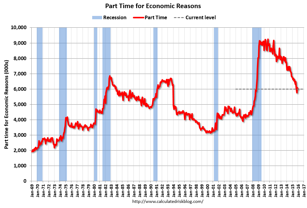 There are still signs of slack (as example, part time workers for economic reasons and elevated U-6), but there also signs the labor market is tightening (wages and U-3). Overall this was a solid employment report. Posted by Bill McBride on 2/05/2016 02:00:00 PM