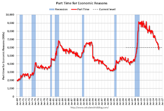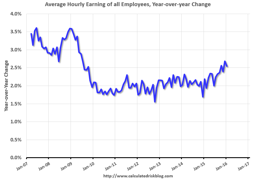 And another positive sign is that wage growth picked up and was above the consensus forecast. From the BLS: "In January, average hourly earnings for all employees on private nonfarm payrolls increased by 12 cents to $25.39. Over the year, average hourly earnings have risen by 2.5 percent."