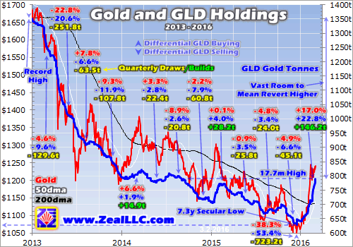 Despite these incredible GLD capital inflows so far in Q1'16, its holdings were merely back to a 17.7-month high as of the middle of this week. In order to mean revert back to 2012 average levels seen before the extreme QE3 distortions, GLD's holdings still have to climb by another 2/3rds or 505.7t! That's another 3.5x as much differential buying of GLD shares as the initial vanguard already witnessed in 2016.