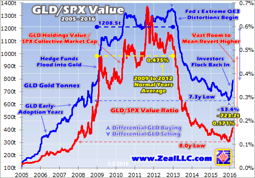 The unprecedented investor flight from gold in recent years leading to the 7.3-year secular low in GLD's holdings the day after that rate hike in mid-December was a gross Fed-conjured anomaly. Gold didn't plunge on collapsing investment demand because it was fundamentally impaired, but because stock markets were being levitated by record extreme Fed easing. Investors abandoned normal prudent diversification.