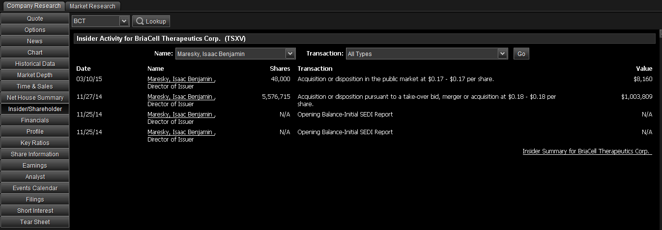 OK I have to ask you where you get that info from. Maresky is still on the BCT board and still has every share he ever got from BCT. Searching through my Quotestream and through Canadian Insider shows not a single sale by Maresky.According to my count he holds 5,625,000 shares of BCT give or take a hundred.Only insider filings last year for BCT were all by Dr Wiseman or Dr Wagner and were all buys but one by Wiseman when he exercised some options to the tune of 70K shares and sold them.
