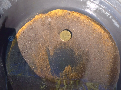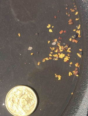 (Figure 2: Very fine to medium gold grains from concentrate produced during commissioning test work on the IGR3000 gold recovery plant. The coin is approximately 1.5 cm across.)