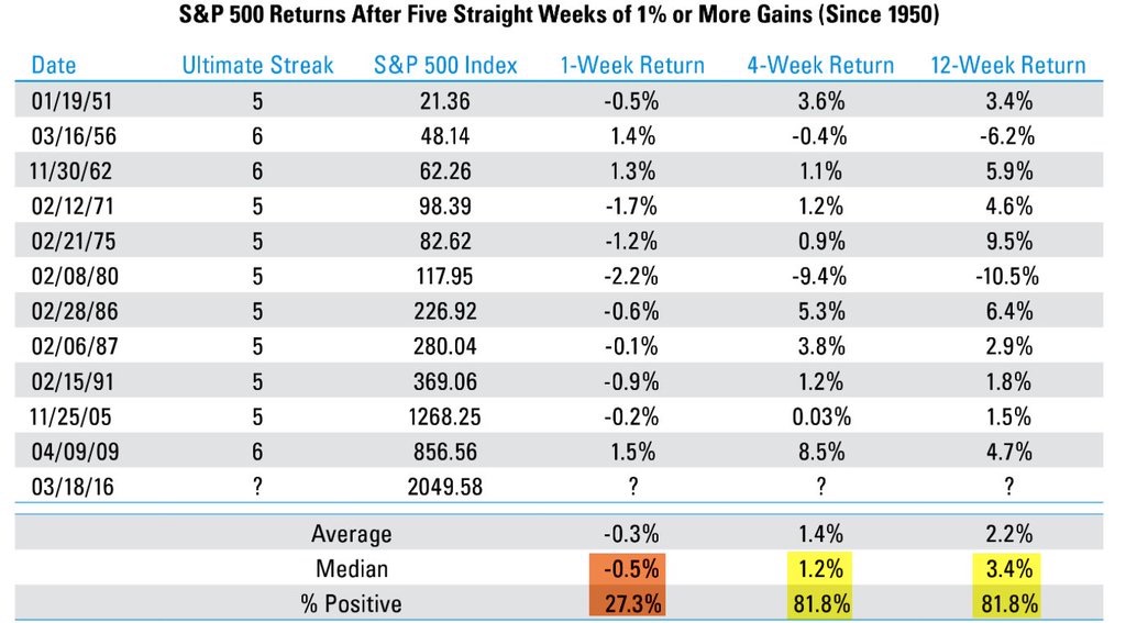 Back to historical analogs. Mkt after 5 up 1% weekly moves is usually down in week 6 but up pretty sharply 3 months later. 80% odds.