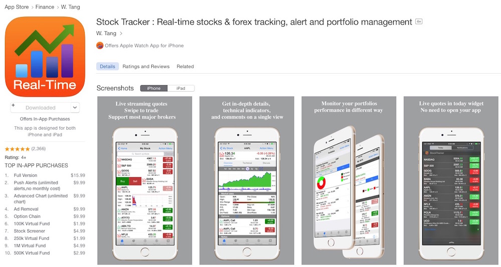 Here is a screenshot of Stock Tracker's app page with some info and pictures of the interface: