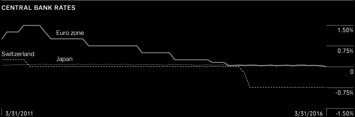 ECB President Mario Draghi currently charges 0.4 percent on the euros deposited by banks in his coffers overnight. BOJ Governor Haruhiko Kuroda, whose country knows more than most about the perils of soft inflation, knocked his benchmark down to an unprecedented -0.1 percent in January. Their counterparts in Sweden, Switzerland, and Denmark have already been running negative campaigns for a while now. The U.S. Federal Reserve has, so far, remained on the sidelines.
