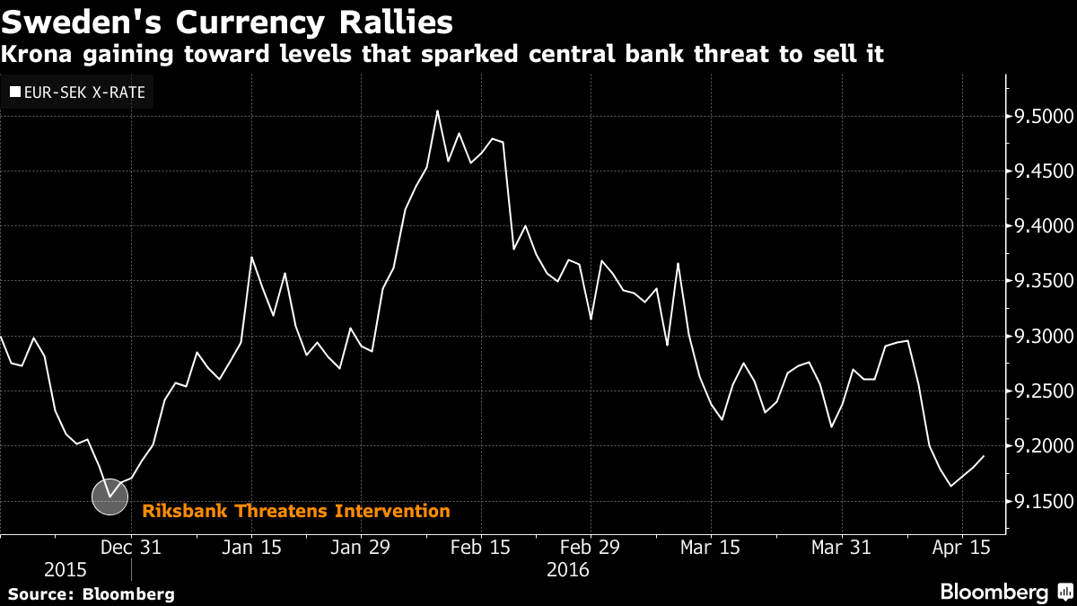 In the crosshairs is Sweden, whose currency has gained at least 0.9 percent against both the euro and the dollar in the past month. A growing number of strategists are suggesting that officials will have to accept a stronger currency, signaling that record amounts of stimulus and the Riksbank’s threat of currency intervention are losing potency.