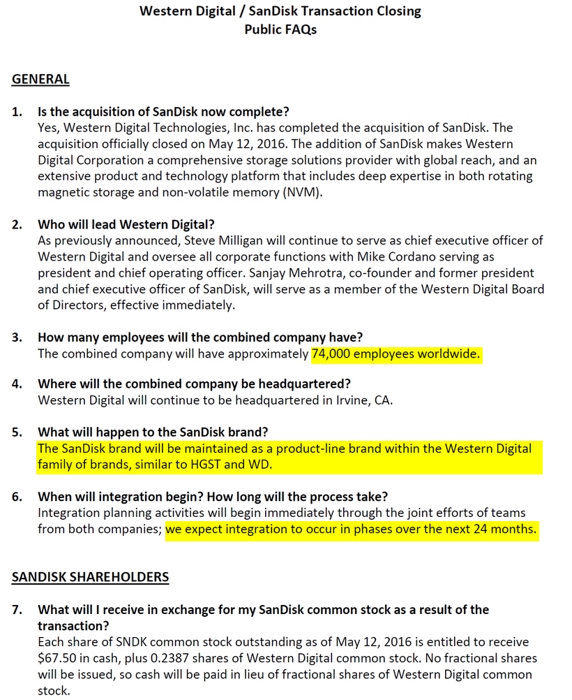 SanDisk shareholders looking for information with regard to the payment of the merger consideration should review the Public FAQ available in the Investor Relations section of our website at investor.wdc.com or click here.