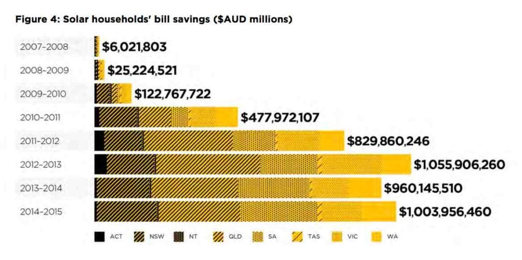 However, because the solar is consumed in the home, and offsets higher retail electricity prices, the savings are even greater, and for each of the last three years, around $1 billion a year has been saved on the electricity bills (taking into account the plethora of different feed in tariffs around the country).