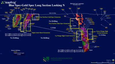 "We are very excited to develop our drill plans at the Blue Spec mine and other targets along the Blue Spec shear zone," commented Dr. Quinton Hennigh, President, CEO and director of Novo Resources. "Both the Blue Spec and Gold Spec deposits display strong evidence for extensions of high grade mineralization. We plan to aggressively drill test the best of these. We also have plans to test multiple high-grade targets in the vicinity of the Blue Spec mine and along the greater Blue Spec shear zone."