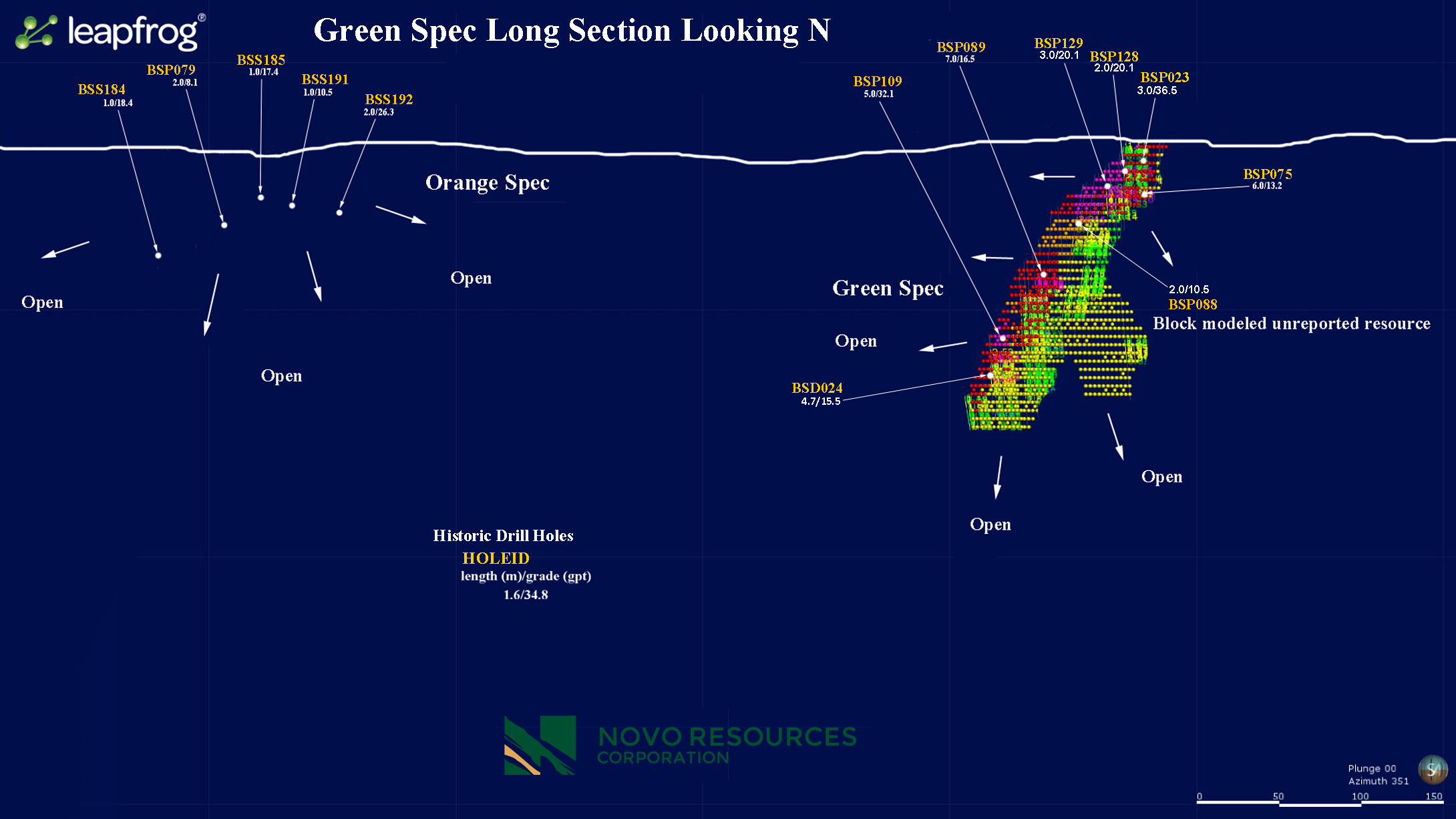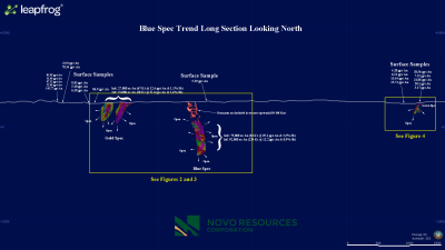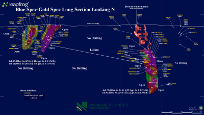 Figure 4 is a longitudinal section detailing the Green Spec and Orange Spec zones nearly 3 km east of the Blue Spec deposit. Both of these targets have seen limited historic drilling, but high-grade drill intercepts are similarly impressive to those at Blue Spec and Gold Spec. Given the deepest drilling in this area is only about 150 m, Novo sees ample reason to drill test both these zones at depth and along strike. Permits have been lodged allowing up to 2,000 m of reverse circulation drilling in this area.