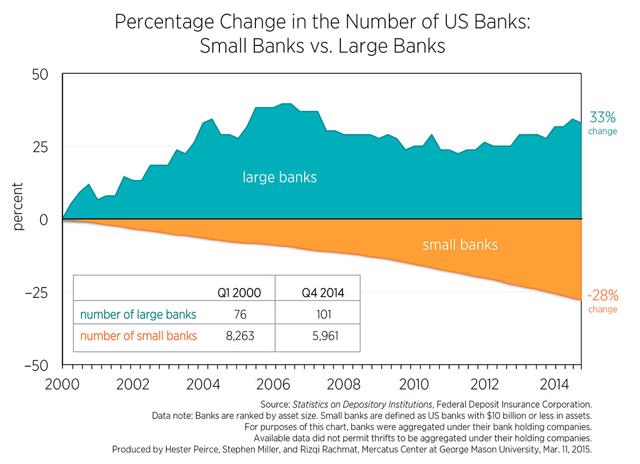 In consequence, global systemic risk is still elevated seven years after the initial crisis, according to Robert Engle and Matthew Richardson of the NYU Stern School of Business (2015). Their work involves estimates of systemic risk (SRISK) that can be aggregated up to country or regional levels (Chart 6). Thus, the banking systems in France, the UK, Greece, Switzerland, and Japan are still relatively large contributors to systemic risk. Reforms since 2008 were generally written in favor of big banks and at the expense of small ones in many places, although the Dodd-Frank legislation in the US seems especially egregious in this regard (Charts 7 and 8). This, plus the failure to fully recapitalize European banks and write off losses has left many giant banks in weak condition. Zombie mega banks are the result: they are neither dead nor alive, but just undead, and they can still cause a systemic crisis.