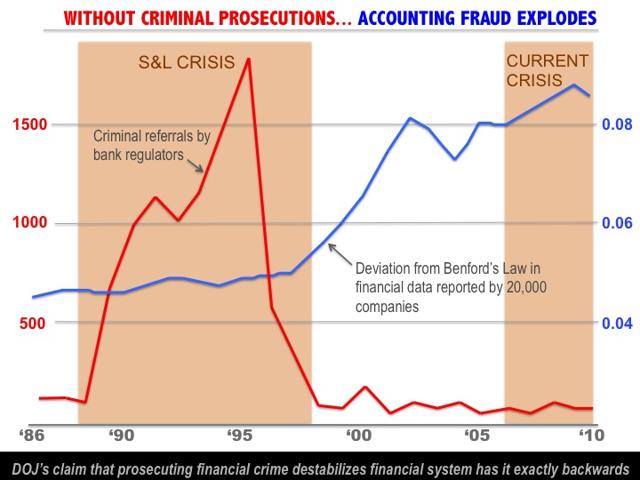 Chart 10 below suggests that the lack of prosecutions since 1998 has actually encouraged accounting fraud, here defined as the violation of Benford's Law (which is a forensic accounting identity that predicts the frequency of specific numbers that should occur in normal accounting data). Jo Craven McGinty ofThe Wall Street Journal has pointed out that the Enron fraud was readily visible on a Benford's Law diagram, and there is still popular anger about that incident many years later.
