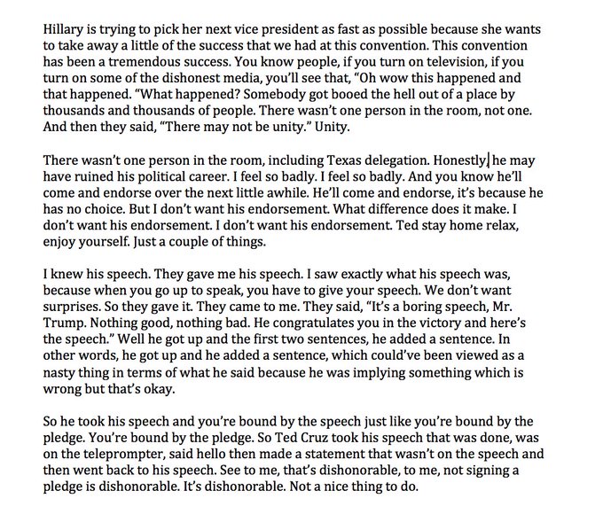 I don't have a transcript but these are the highlights. Ted Cruz violated campaign finance laws. The National Enquirer is highly credible. No one has ever denied that Ted Cruz's father shot JFK. Ted Cruz's PAC attacked Melania Trump. Melania Trump didn't marry Donald for money because she made a lot of money lolling around naked. Ted Cruz changed his speech. Trump doesn't want Ted Cruz's endorsement and wouldn't accept it.