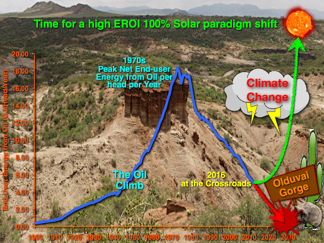 In my view, given that nearly everything within the GIW requires transport and that said transport is still about 94% dependent on oil-derived fuels, the rapid fizzling out of net energy from oil must be considered as the defining event of the 21st century – it governs the operation of all other energy sources, as well as that of the entire GIW. In this respect, the critical parameter to consider is not that absolute amount of oil mined (as even “peakoilers” do), such as Million barrels produced per year, but net energy from oil per head of global population, since when this gets too close to nil we must expect complete social breakdown, globally.