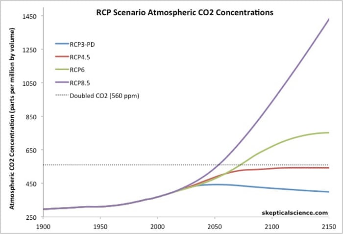 There are an infinite number of potential carbon emissions pathways, but the 2014 IPCC report considered four possible paths that they called RCPs. In one of these (called RCP 2.6 or RCP3-PD), we take immediate, aggressive, global action to cut carbon pollution, atmospheric carbon dioxide levels peak at 443 ppm in 2050, and by 2100 they’ve fallen back down to today’s level of 400 ppm. In two others (RCPs 4.5 and 6.0) we act more slowly, and atmospheric levels don’t peak until the year 2150, then they remain steady, and in the last (RCP8.5) carbon dioxide levels keep rising until 2250.
