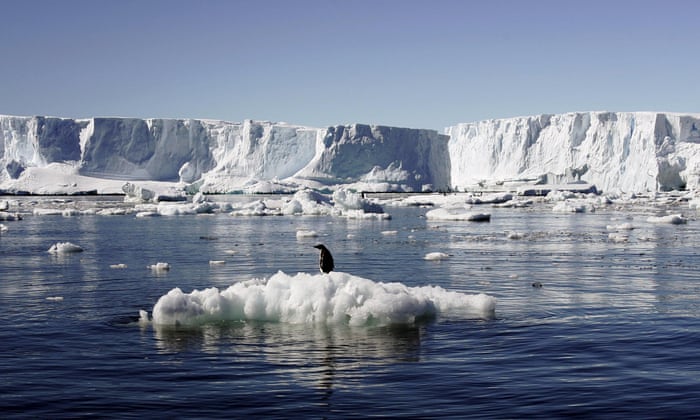 An Adelie penguin standing atop a block of melting ice in East Antarctica. Slowly-melting ice is a ‘feedback’ through which today’s carbon pollution will heat the planet for centuries to come. Photograph: Reuters Dana Nuccitelli