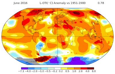 There are now ten in a row of "hottest months" from October 2015 to July 2016 (that is, hottest October, hottest November etc). If we could look back over the entire Holocene, it's probably more than 7,000 years since there was a similar run of hottest months on record, that is, not since the Holocene climatic optimum (it's probably hotter now than it was back then).